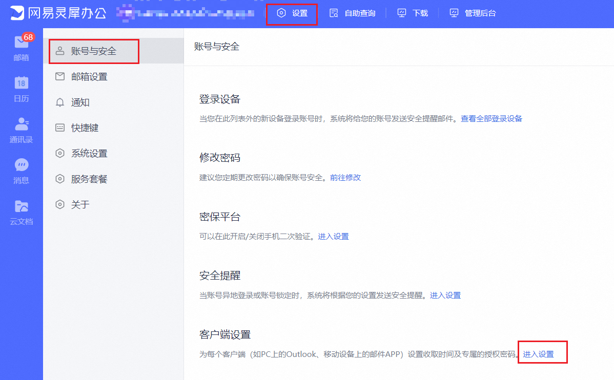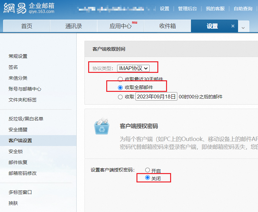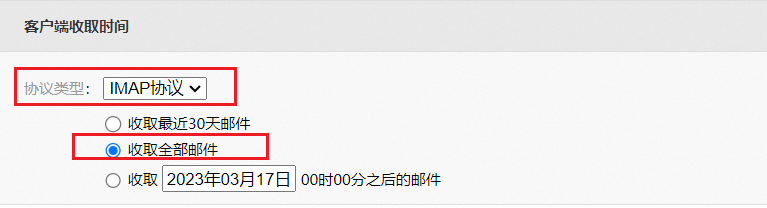 1、请确保已经把“客户端收取时间”设置为“收取全部的邮件”,否则只能搬最近30天的邮件。设置->账号与安全->客户端设置中点击“进入设置”,会打开新的浏览器标签页,在新标签页中选择搬家用的协议如“IMAP协议”、选择“收取全部的邮件”。