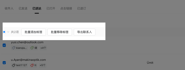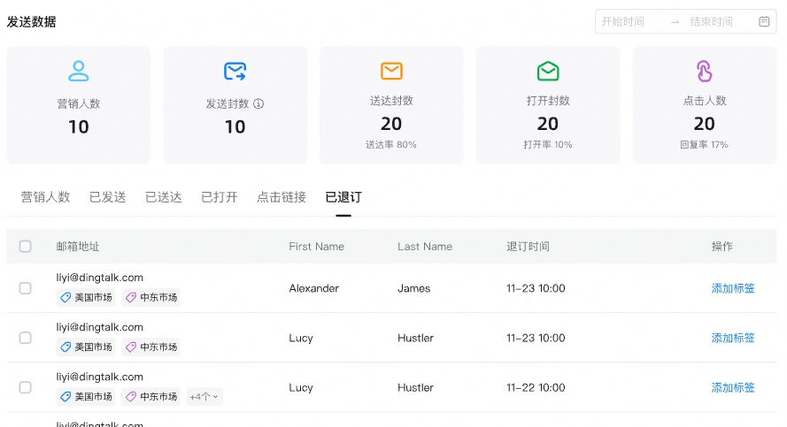 ● 一键打标:根据收件人的打开、点击、退订行为,快速标记不同用户类别。